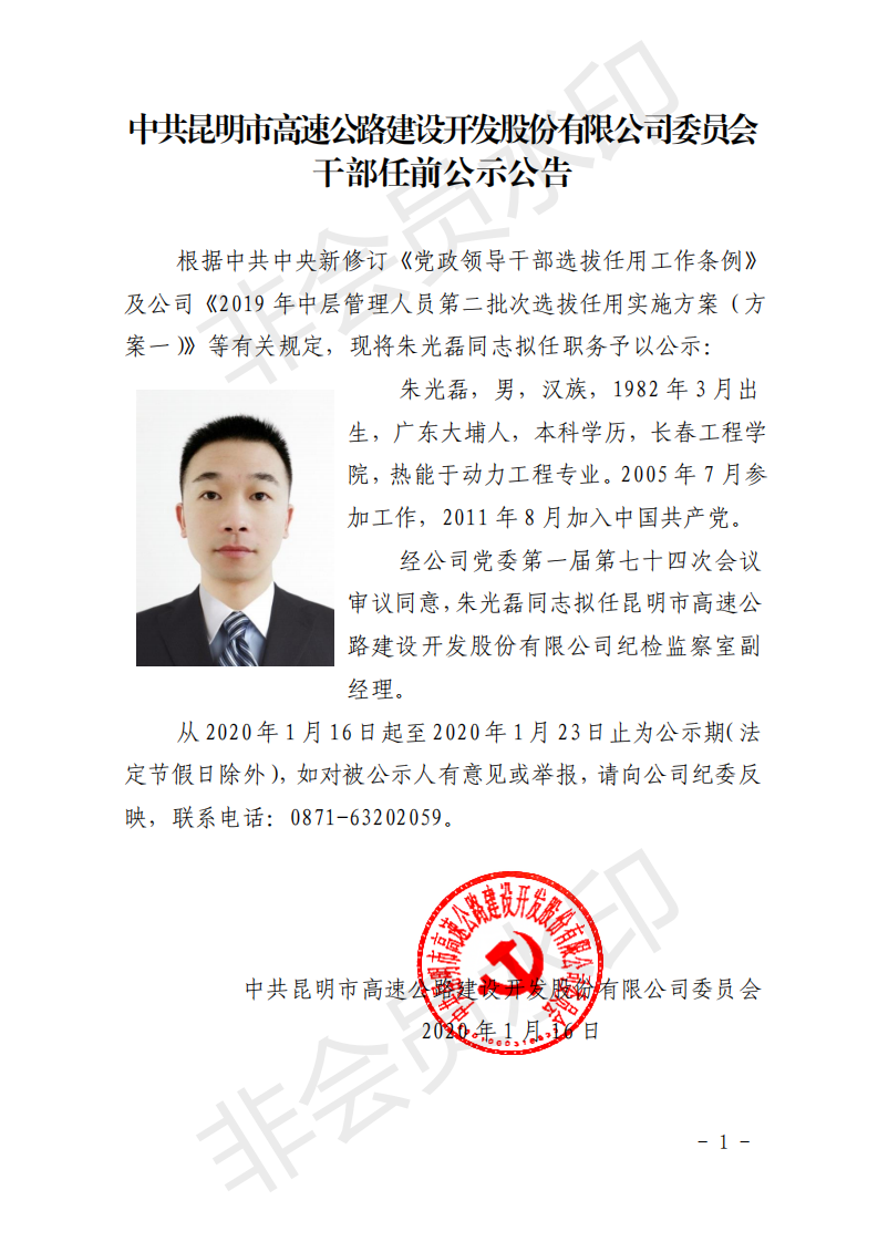 中共昆明市高速公路建设开发股份有限公司委员会干部任前公示公告