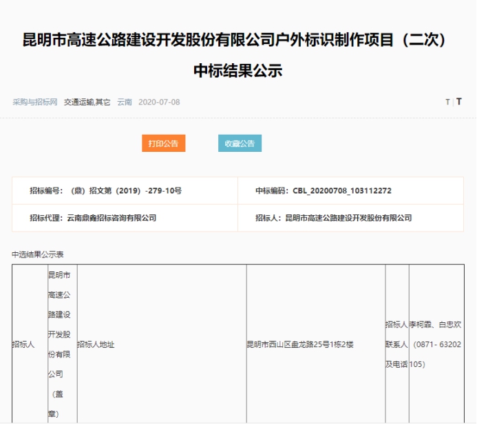 昆明市高速公路建设开发股份有限公司户外标识制作项目(二次)中标结果公示