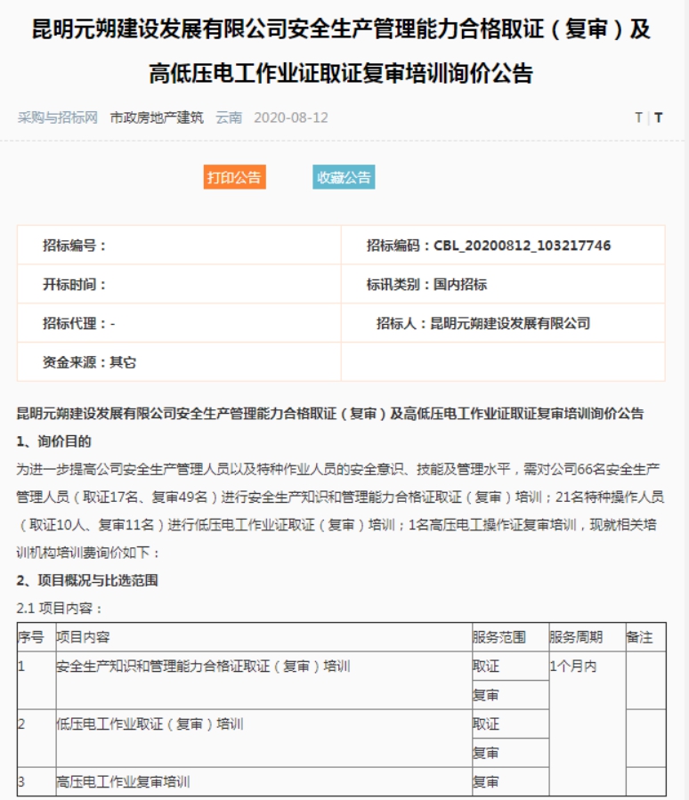 昆明元朔建设发展有限公司安全生产管理能力合格取证(复审)及高低压电工作业证取证复审培训询价公告
