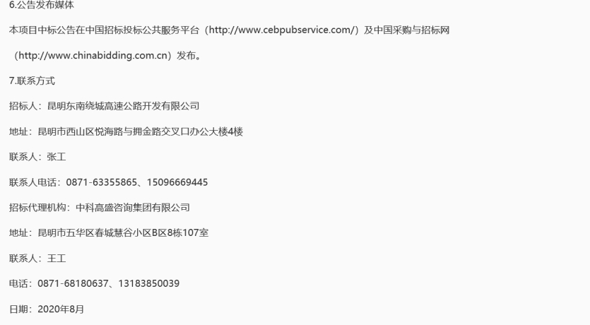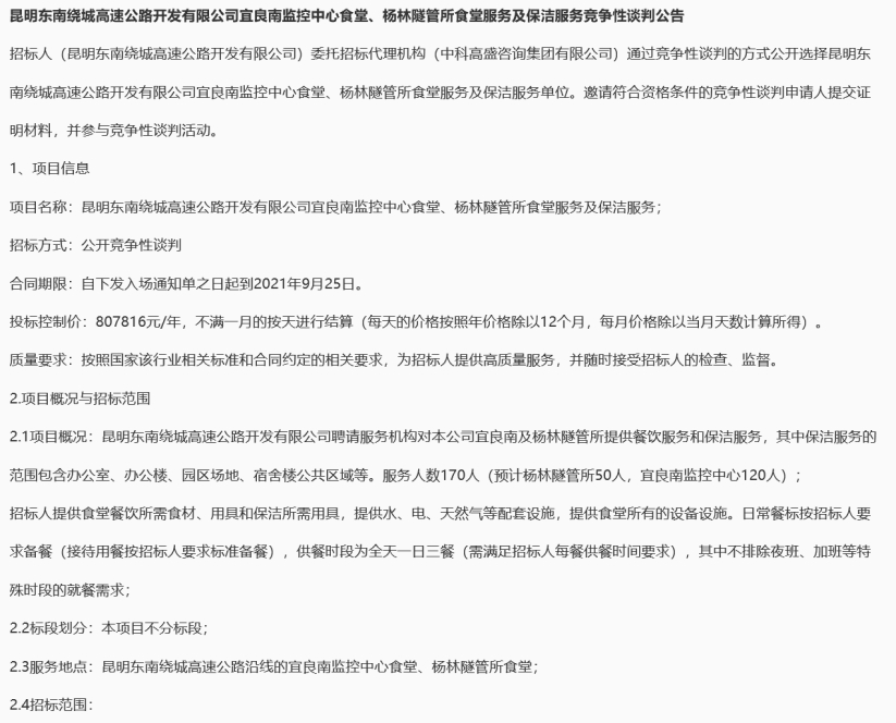 昆明东南绕城高速公路开发有限公司宜良南监控中心食堂、杨林隧管所食堂服务及保洁服务竞争性谈判公告