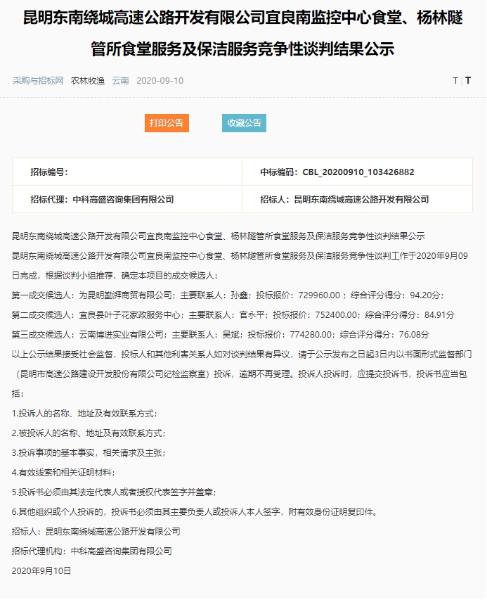 昆明东南绕城高速公路开发有限公司宜良南监控中心食堂、杨林隧管所食堂服务及保洁服务竞争性谈判结果公示