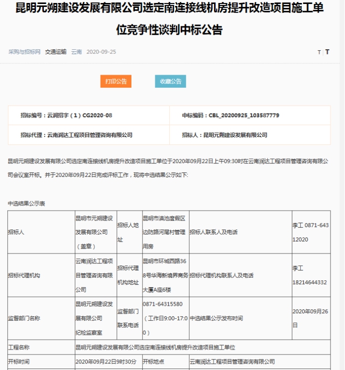 昆明元朔建设发展有限公司选定南连接线机房提升改造项目施工单位竞争性谈判中标公告