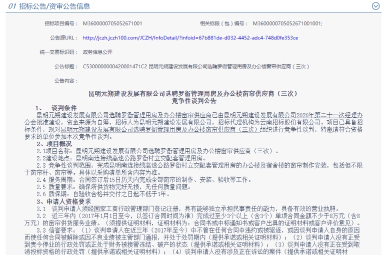 昆明元朔建设发展有限公司选聘罗衙管理用房及办公楼窗帘供应商(三次)竞争性谈判公告