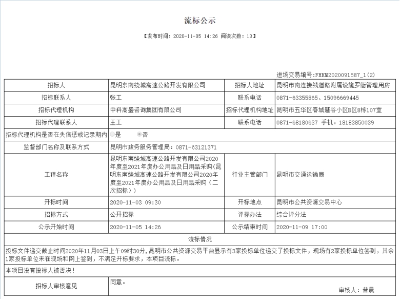 昆明东南绕城高速公路开发有限公司2020年度至2021年度办公用品及日用品采购(二次招标)流标公示