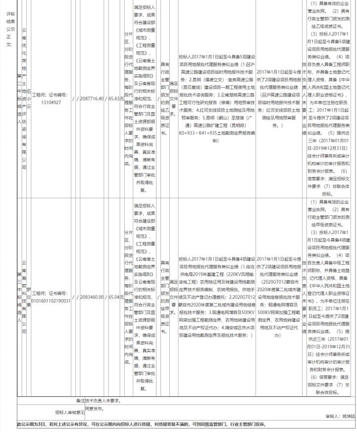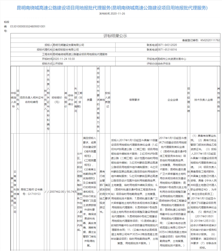 昆明南绕城高速公路建设项目用地报批代理服务评标结果公示