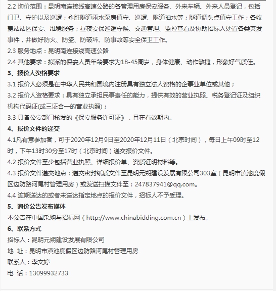 昆明元朔建设发展有限公司保安服务市场询价公告