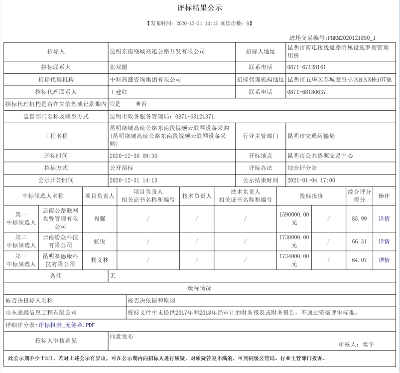 昆明绕城高速公路东南段视频云联网设备采购评标结果公示