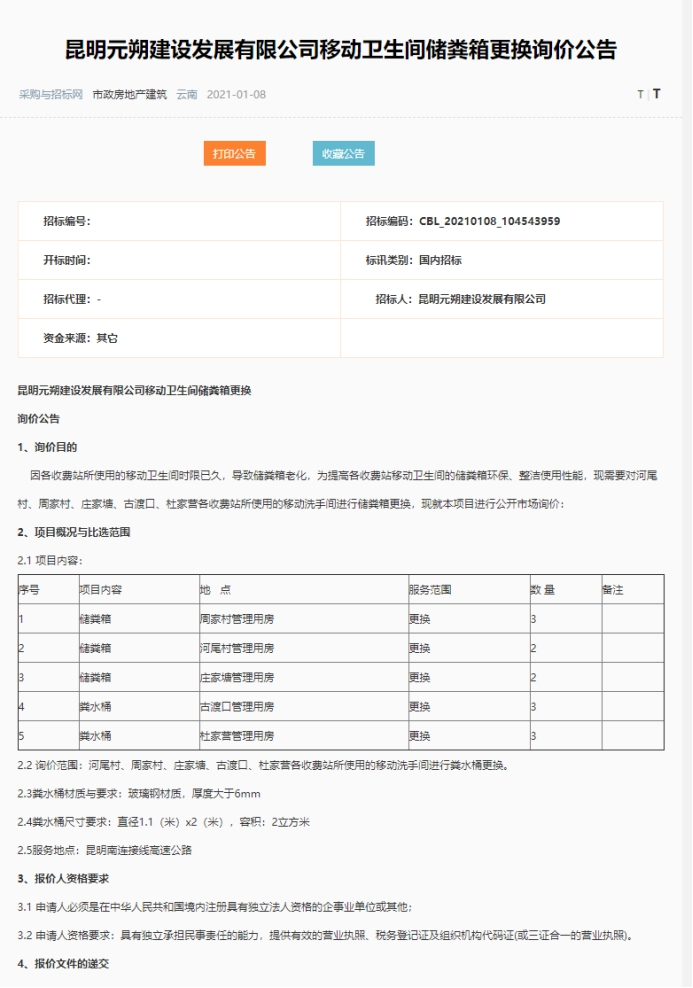 昆明元朔建设发展有限公司移动卫生间储粪箱更换询价公告