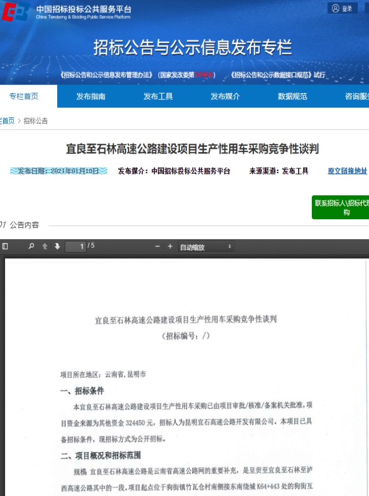 宜良至石林高速公路建设项目生产性用车采购竞争性谈判公告