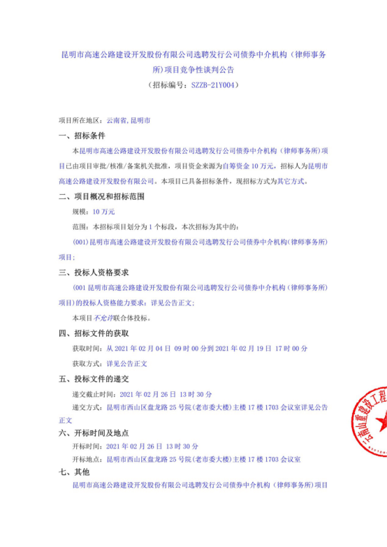 昆明市高速公路建设开发股份有限公司选聘发行公司债券中介机构(律师事务所)项目竞争性谈判公告