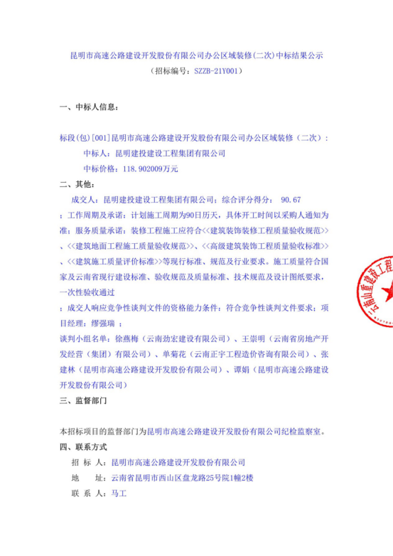 昆明市高速公路建设开发股份有限公司办公区域装修(二次)中标结果公示