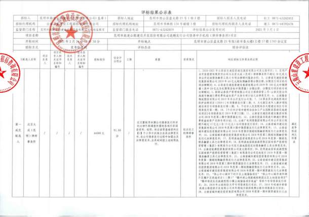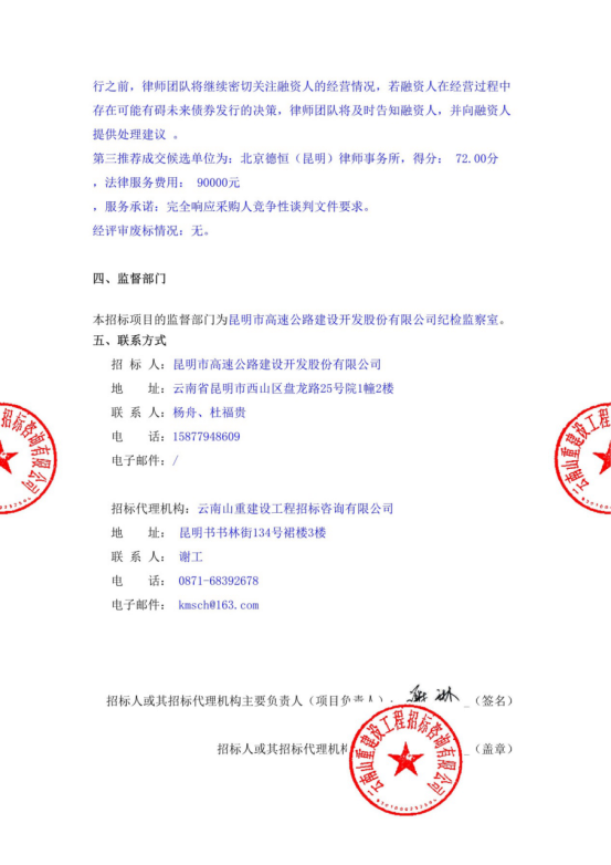 昆明市高速公路建设开发股份有限公司选聘发行公司债券中介机构(律师事务所)项目评标结果公示