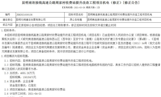 昆明南连接线高速公路周家村收费站提升改造工程项目机电(修正)修正公告