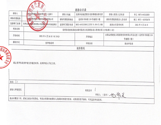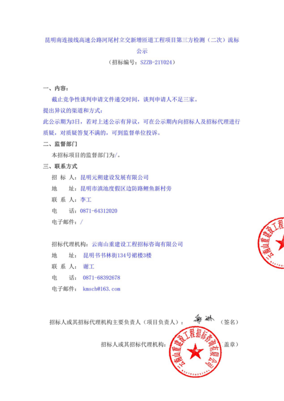 昆明南连接线高速公路河尾村立交新增匝道工程项目第三方检测(二次)流标公示