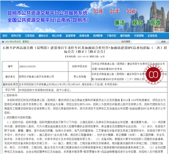 石林至泸西高速公路(昆明段)建设项目乍龙停车区及加油站合作经营+加油站建设EPC总承包招标(二次)招标公告(修正)[修正公告]