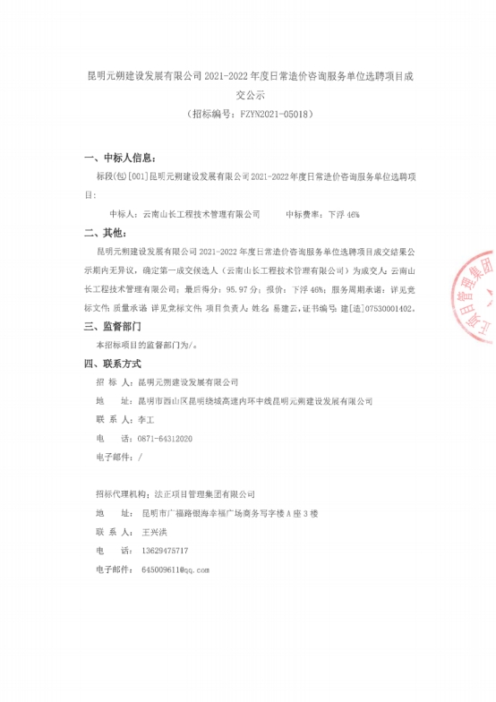昆明元朔建设发展有限公司2021-2022年度日常造价咨询服务单位选聘项目中标结果公示