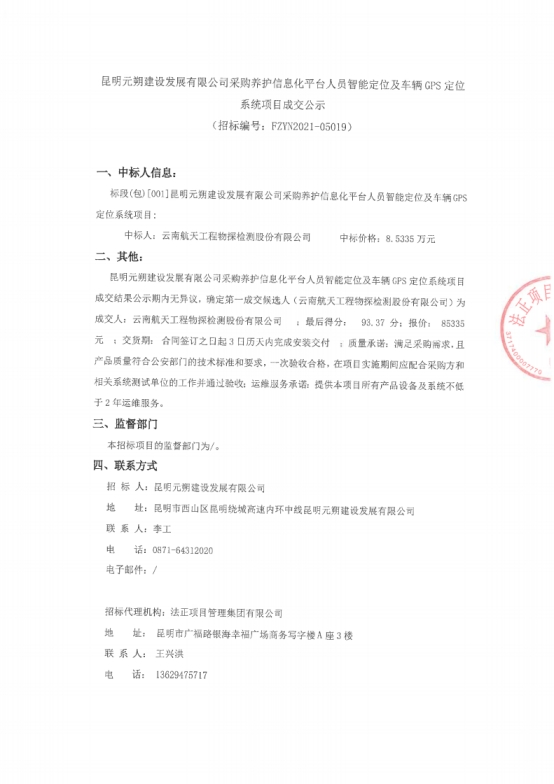 昆明元朔建设发展有限公司采购养护信息化平台人员智能定位及车辆GPS定位系统项目中标结果公示
