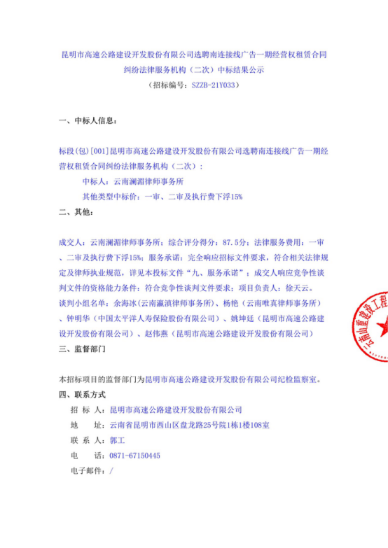 昆明市高速公路建设开发股份有限公司选聘南连接线广告一期经营权租赁合同纠纷法律服务机构(二次)中标结果公示