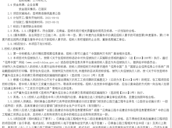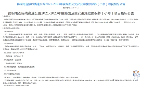 昆明南连接线高速公路2021-2023年度路面及交安设施维修保养(小修)项目招标公告