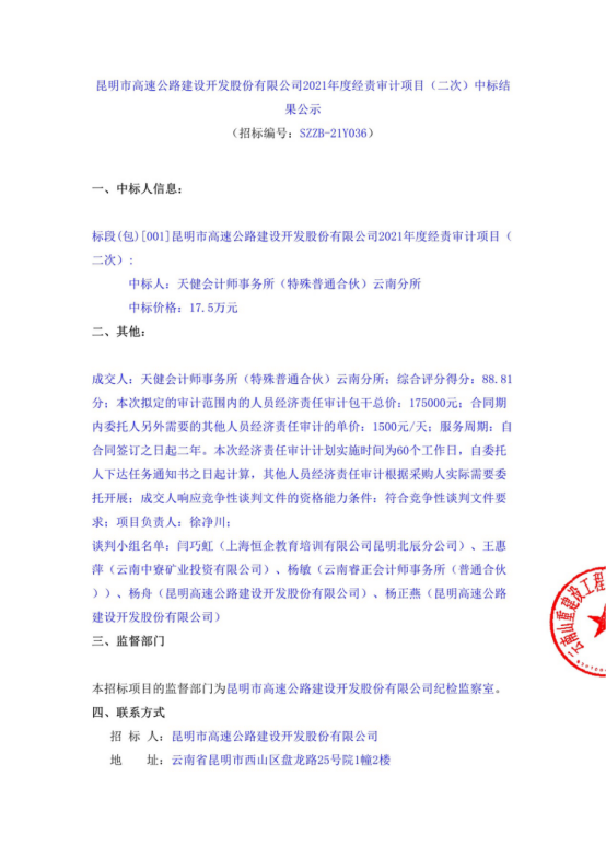 昆明市高速公路建设开发股份有限公司2021年度经责审计项目(二次)中标结果公示
