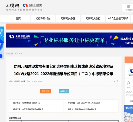 昆明元朔建设发展有限公司选聘昆明南连接线高速公路配电室及10kV线路2021-2022年度运维单位项目(二次)中标结果公示