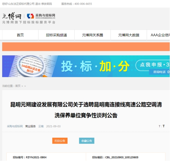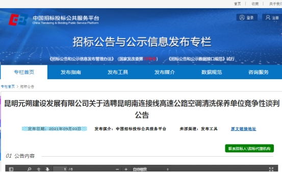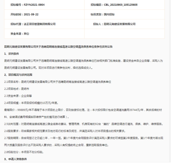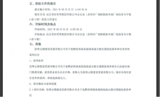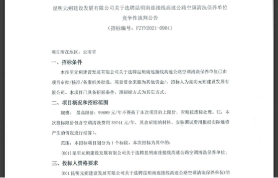昆明元朔建设发展有限公司关于选聘昆明南连接线高速公路空调清洗保养单位竞争性谈判公告