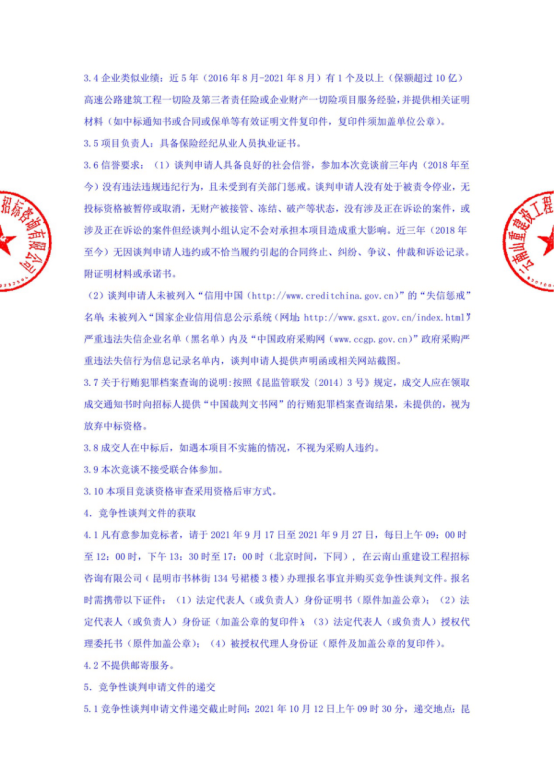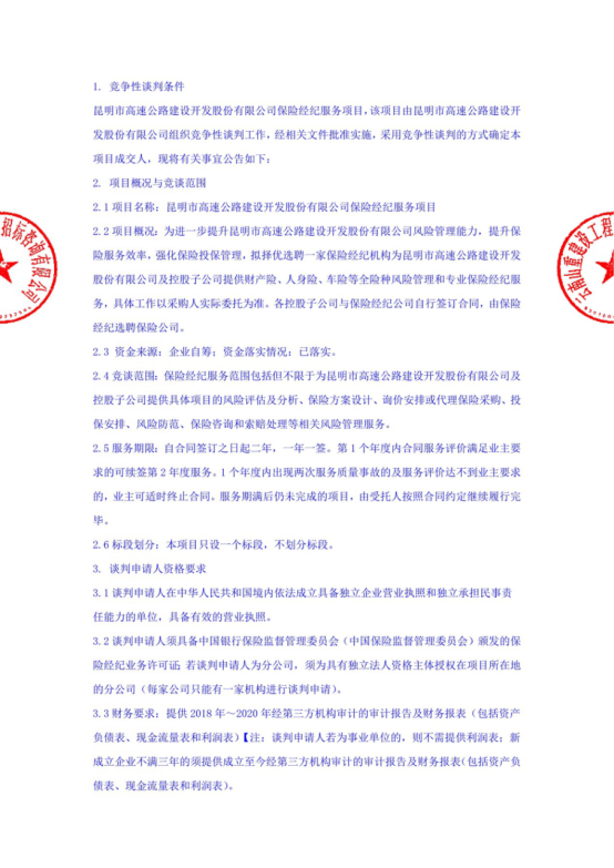 昆明市高速公路建设开发股份有限公司保险经纪服务项目竞争性谈判公告