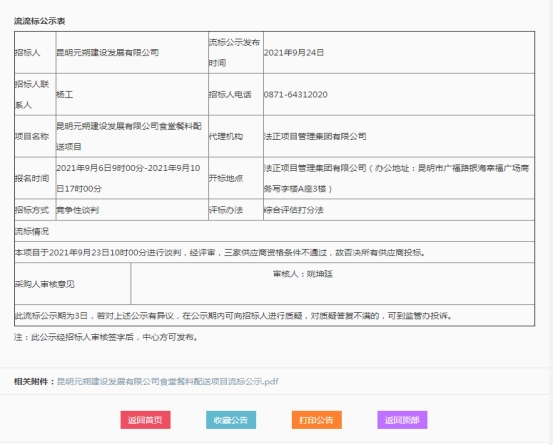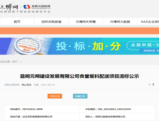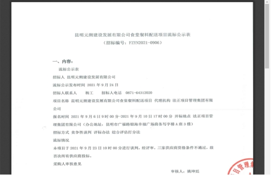 昆明元朔建设发展有限公司食堂餐料配送项目流标公示