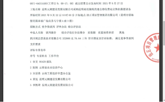 昆明元朔建设发展有限公司采购昆明南连接线高速公路收费站交换机数据设备成交结果公示