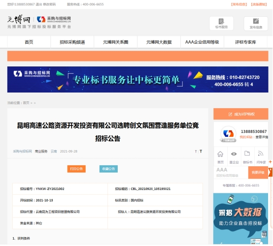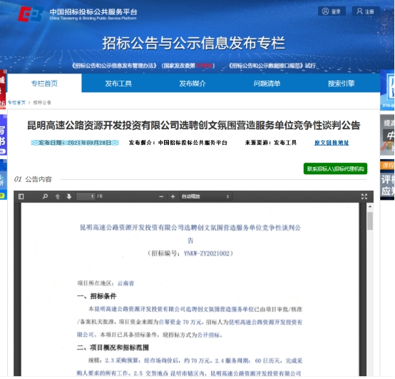 昆明高速公路资源开发投资有限公司选聘创文氛围营造服务单位项目竞争性谈判公告
