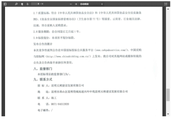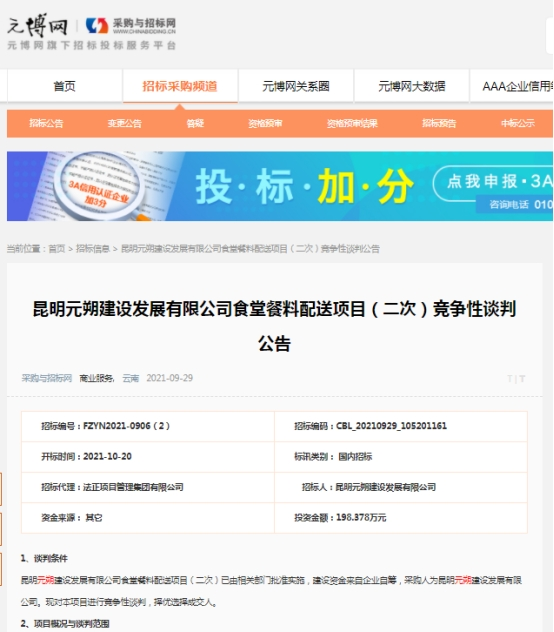 昆明元朔建设发展有限公司食堂餐料配送项目(二次)竞争性谈判公告
