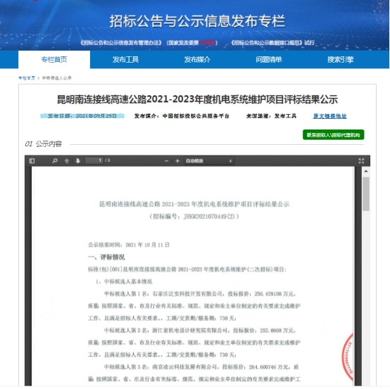 昆明南连接线高速公路2021-2023年度机电系统维护项目评标结果公示