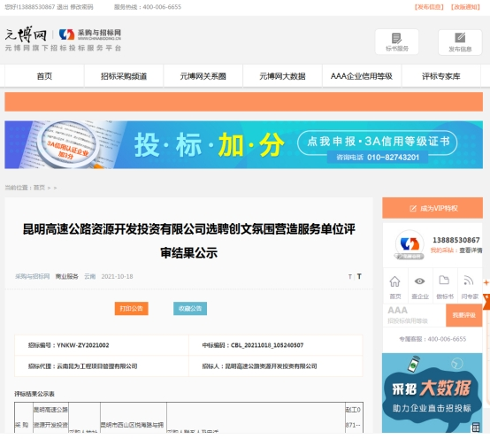 昆明高速公路资源开发投资有限公司选聘创文氛围营造服务单位评审结果公示