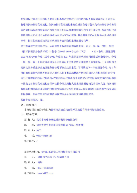 昆明石泸高速公路开发有限公司选聘2022-2023年度项目招标代理机构(二次)中标候选人公示