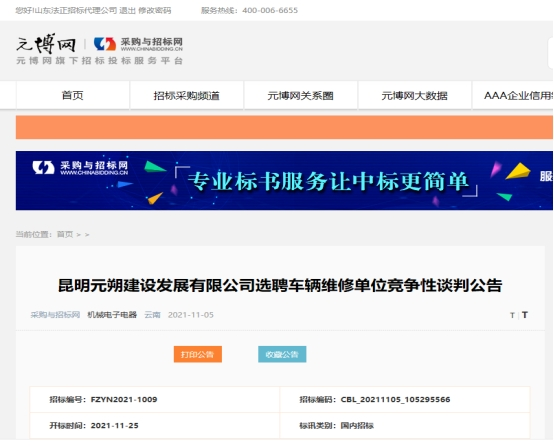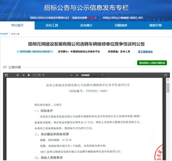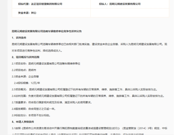 昆明元朔建设发展有限公司选聘车辆维修单位竞争性谈判公告