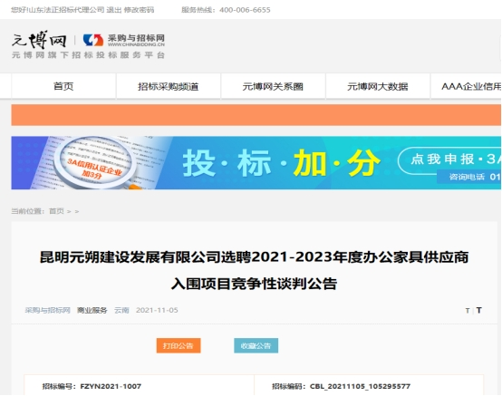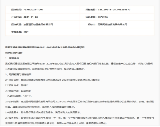 昆明元朔建设发展有限公司选聘2021-2023年度办公家具供应商入围项目竞争性谈判公告