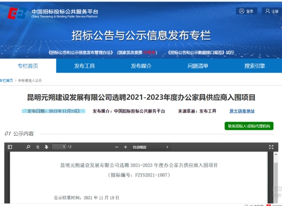 昆明元朔建设发展有限公司选聘2021-2023年度办公家具供应商入围项目竞争性谈判流标公示