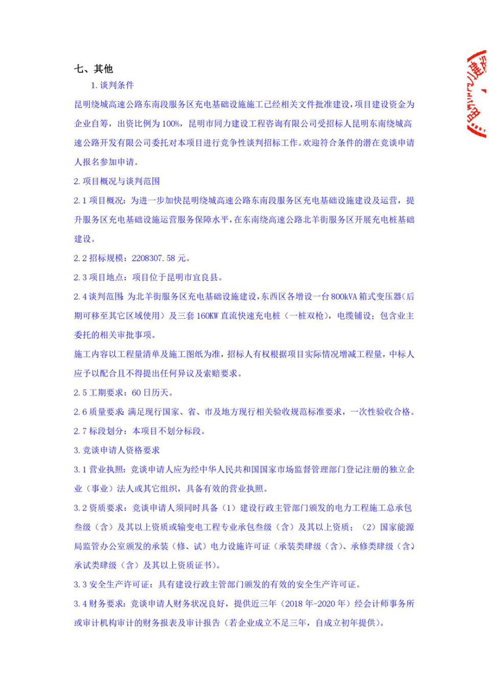 昆明绕城高速公路东南段服务区充电基础设施施工竞争性谈判公告