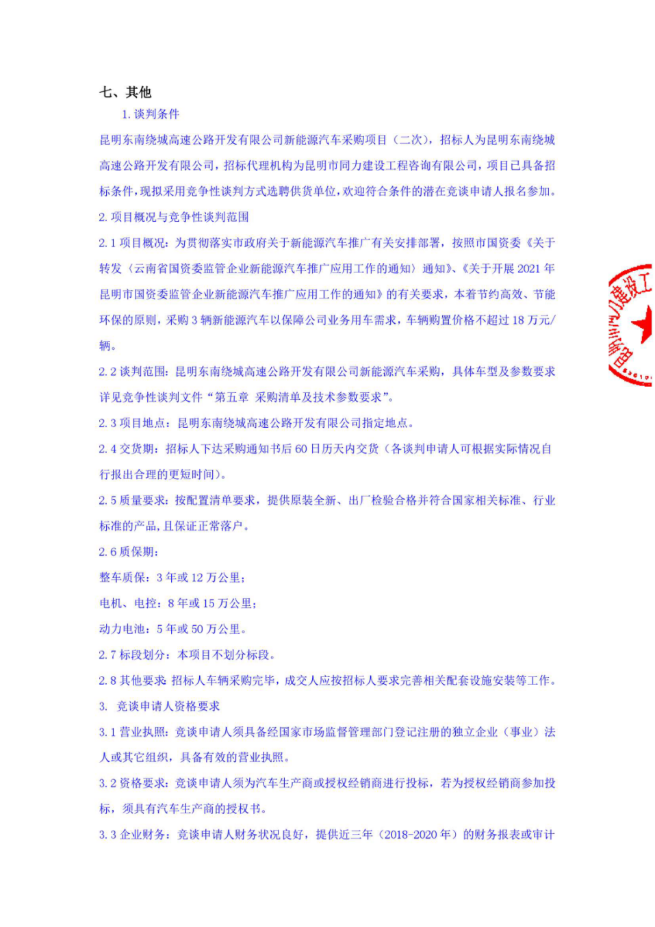 昆明东南绕城高速公路开发有限公司新能源汽车采购项目(二次)竞争性谈判公告