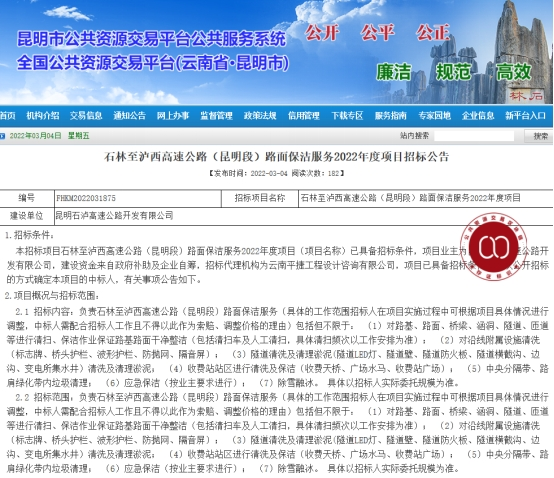 石林至泸西高速公路(昆明段)路面保洁服务2022年度项目招标公告