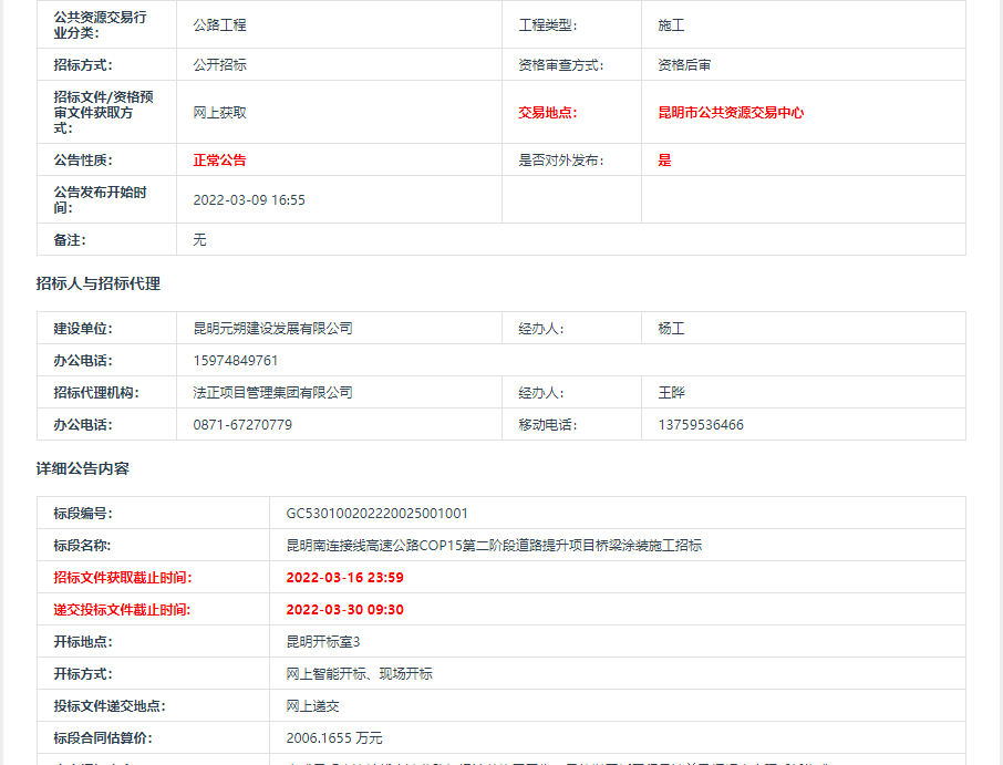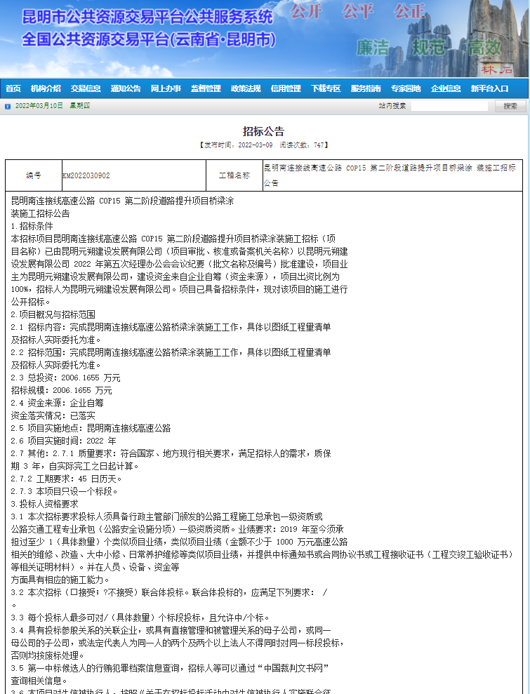 昆明南连接线高速公路COP15第二阶段道路提升项目桥梁涂装施工招标公告