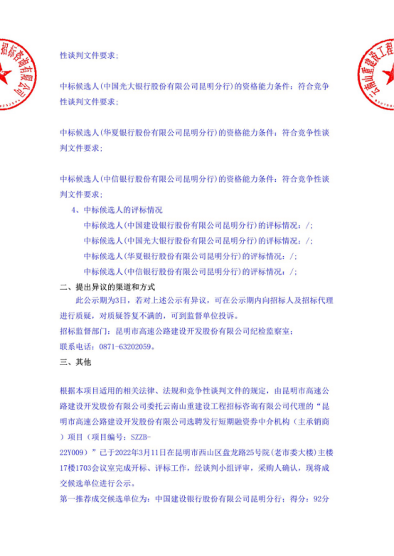 昆明市高速公路建设开发股份有限公司选聘发行短期融资券中介机构(主承销商)项目中标候选人公示