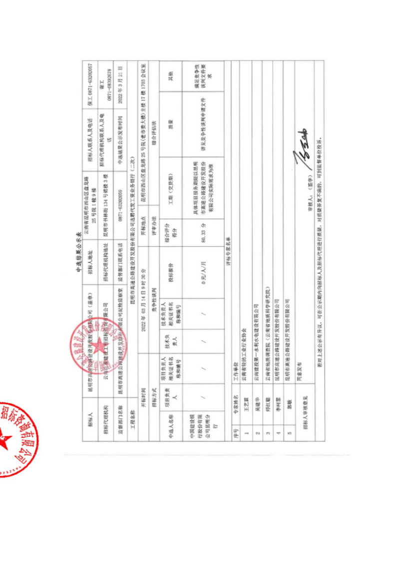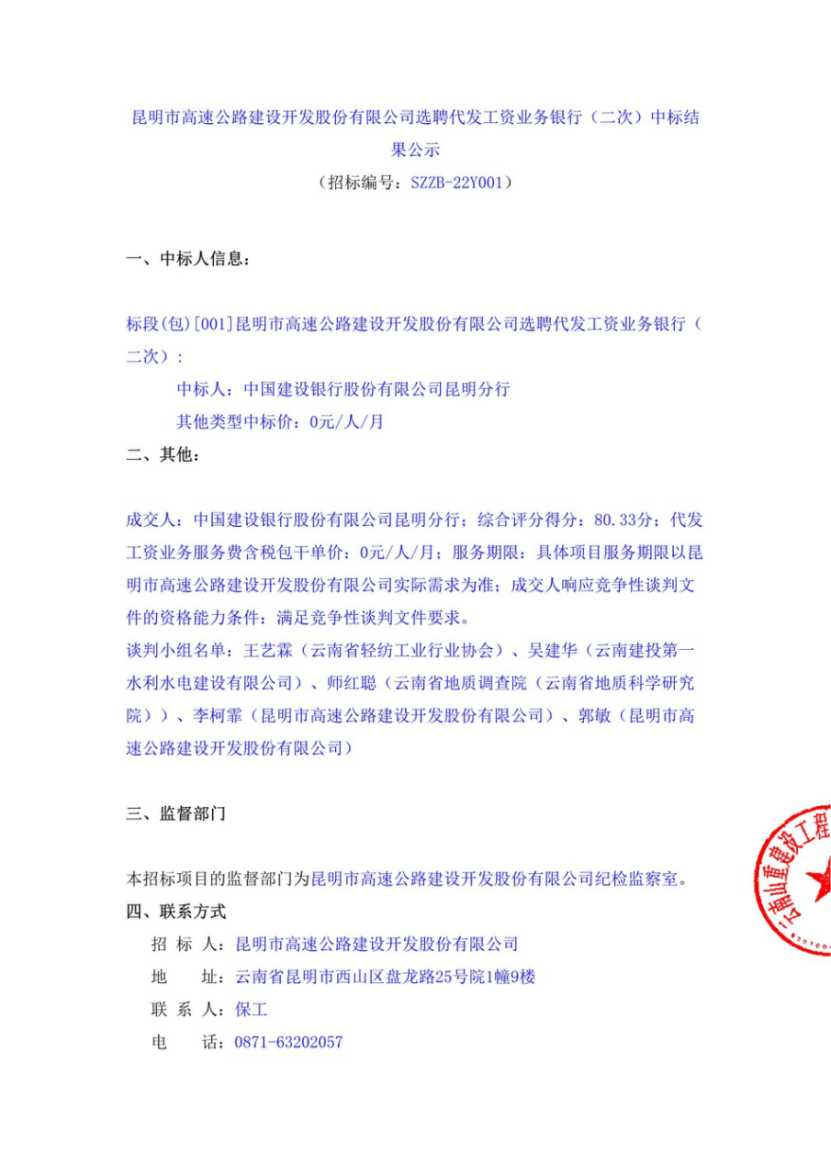 昆明市高速公路建设开发股份有限公司选聘代发工资业务银行(二次)中标结果公示