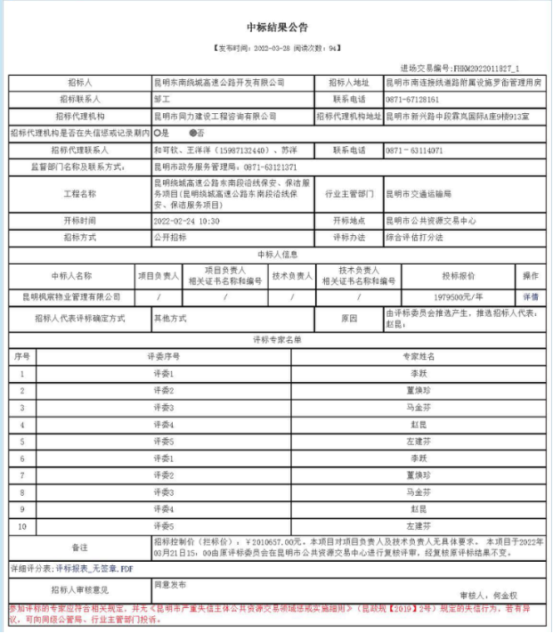 昆明绕城高速公路东南段沿线保安、保洁服务项目中标结果公告
