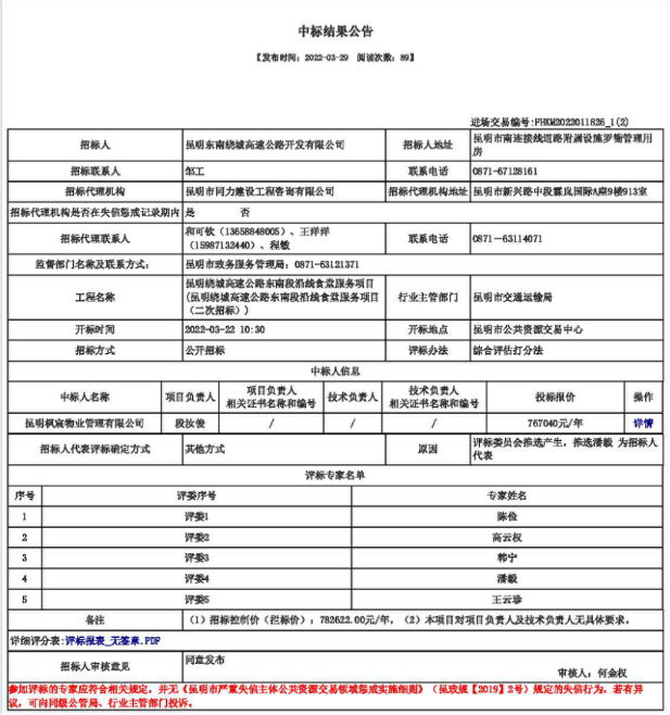 昆明绕城高速公路东南段沿线食堂服务项目(昆明绕城高速公路东南段沿线食堂服务项目(二次)中标结果公告