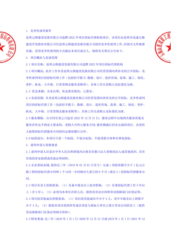 昆明元朔建设发展有限公司选聘2022年项目招标代理机构竞争性谈判公告