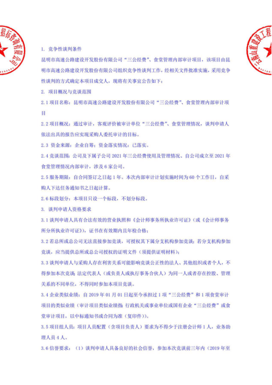 昆明市高速公路建设开发股份有限公司“三公经费”、食堂管理内部审计项目竞争性谈判公告