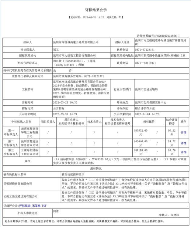 昆明东南绕城高速公路开发有限公司2022-2023年安全物资、防疫物资、消防应急物资采购评标结果公示