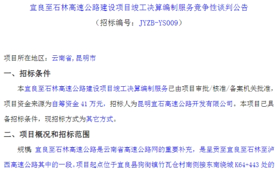 宜良至石林高速公路建设项目竣工决算编制服务竞争性谈判公告