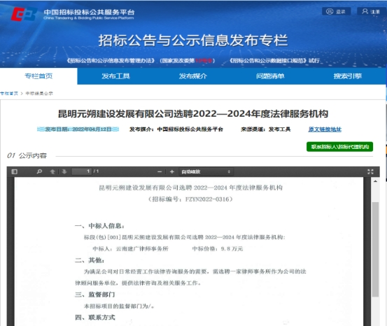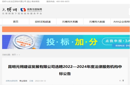 昆明元朔建设发展有限公司选聘2022-2024年度法律服务机构中标结果公示